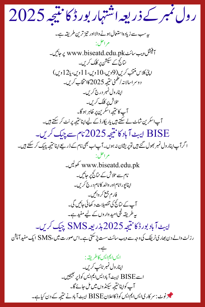 The Board of Intermediate and Secondary Education Abbottabad (BISE ATD) has formally proclaimed the Supplementary / 2nd Annual Examination Result 2025 for 9th, 10th, 11th, and 12th classes. This result is very significant for scholars who appeared in the second annual exams to improve their marks or strong failed subjects. Students can now check BISE Abbottabad Result 2025 online through the official website www.biseatd.edu.pk using dissimilar approaches like roll number, name, and SMS. This guide provides A to Z complete information in simple language so pupils and parents do not need to search wherever else.