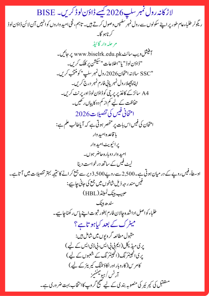 The announcement of the BISE Larkana 2026 Matric exam schedule has given students a clear timeline to prepare seriously. With exams starting on March 31, proper planning and disciplined study are necessary. Students from Larkana and surrounding districts should stay connected with their schools and regularly check the official board website for updates.