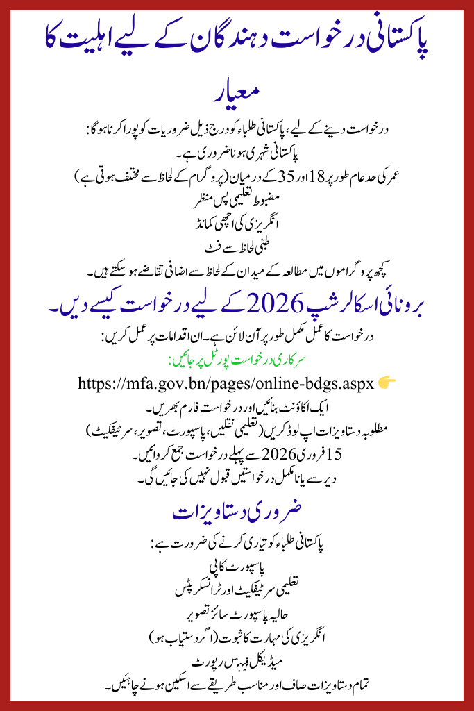The Brunei Darussalam Government Scholarship 2026 is an excellent chance for Pakistani students to study abroad with full financial support. With a simple online application process and extensive range of programs, this scholarship opens doors to a brighter future. Interested students must apply as early as likely to increase their chances of selection.