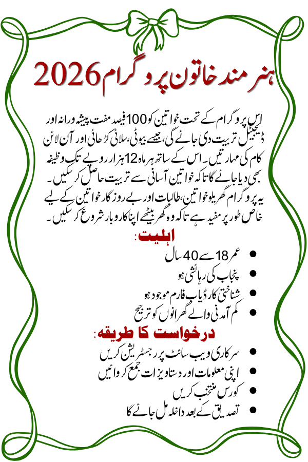 The Hunar-mand Khatoon Program 2026 – Free Courses for Women is a landmark initiative that offers a lifeline to women seeking independence and professional growth. By providing 100% free training, a generous monthly stipend of 12,000 PKR, and the tools needed for success, the Punjab government is truly empowering the female workforce of 2026. Whether you want to master the art of beauty, stitching, or digital entrepreneurship, the Official Hunarmand Punjab Portal is your gateway to a brighter future. Don’t wait for the application deadline to pass—gather your documents, choose your course, and complete your Step-by-Step registration today. Your journey from a learner to an earner starts with this single click, so seize this opportunity to transform your life and support your family with dignity.