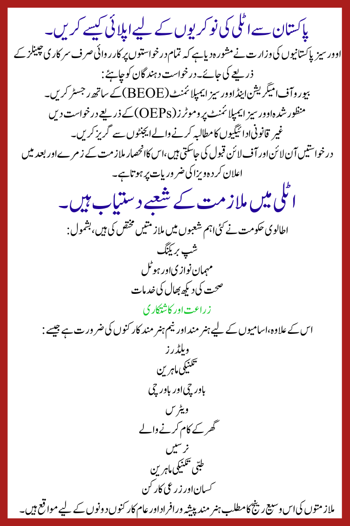The Italy Announces 10500 Jobs for Pakistanis in several important sectors, including: