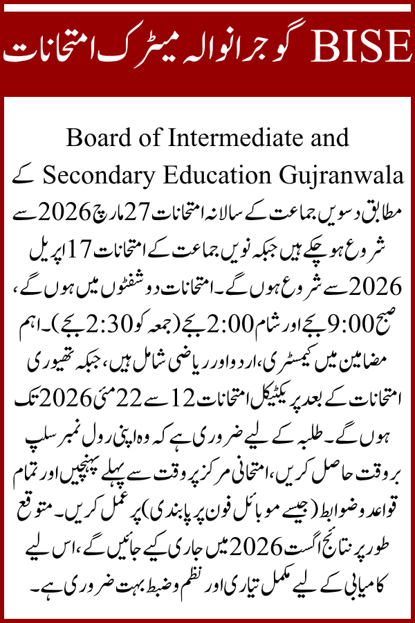The Matric Exam Date Sheet 2026 for Gujranwala Board provides a clear roadmap for students. With Matric Exam Date Sheet starting on March 27 and 9th class exams on April 17, students must stay focused and prepared. Proper planning, timely arrival, and following exam rules are key to success. Keep checking official updates and prepare well for important subjects like Chemistry and Mathematics. Best of luck to all students for their exams and future success.