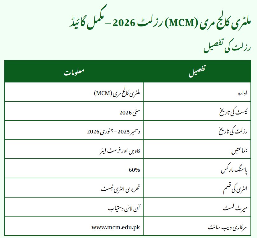 Military College Murree (MCM) is set to announce the MCM Result 2026 for Class 8th and 1st Year admissions. Students who appeared in the written entry test can check their results online through the official MCM website. This year, thousands of candidates applied for Pre-Medical and Pre-Engineering programs, and only shortlisted students will proceed to the interview and medical test stage.