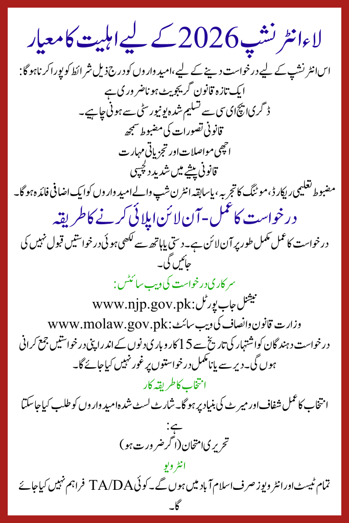The Government of Pakistan has formally announced a high-paid Law Internship Program 2026 finished the Ministry of Law & Justice, creating an excellent opportunity for fresh law graduates crossways Pakistan. This residency will be offered in the Office of the Attorney General for Pakistan, one of the most respected lawful workplaces in the republic. The program is particularly designed to provide real legal exposure, hands-on experience, and professional training to young lawyers who want to build a strong future in the legal field. What makes this internship stand out is its attractive monthly stipend of up to Rs. 100,000, which is rarely offered in residencies in Pakistan.