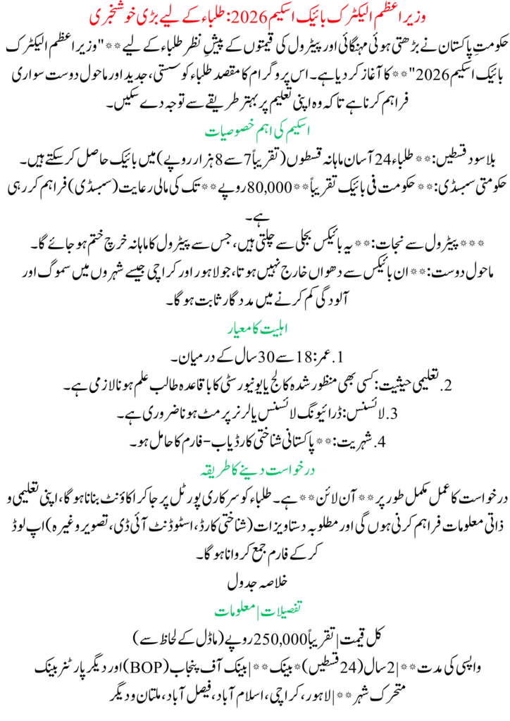 The Government of Pakistan has introduced a major initiative for students called the PM Electric Bike Scheme 2026. This program aims to help students who face difficulties due to rising petrol prices and expensive transportation. Under this scheme, students can receive an electric bike on easy and interest-free installments, making daily travel to universities and colleges much more affordable.
