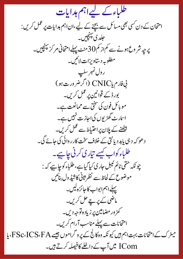 This schedule applies to all Boards of Intermediate and Secondary Education (BISE) in Punjab. Both morning and evening groups will follow the same dates. Morning papers will begin at 9:00 AM, while evening papers will start at 2:00 PM. On Fridays, evening papers will begin at 2:30 PM.