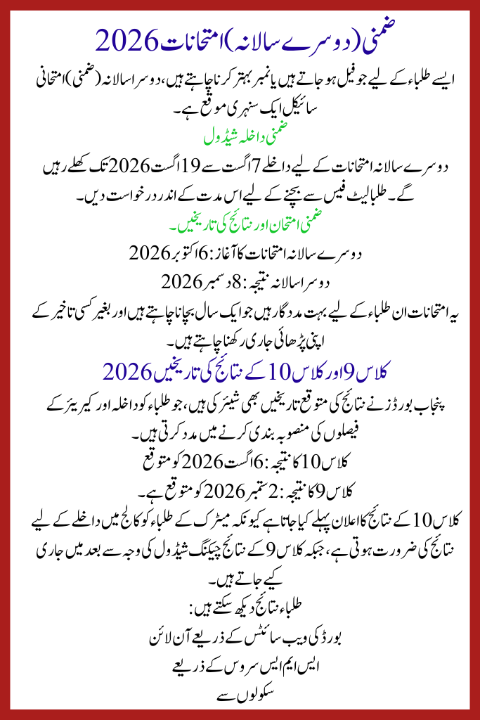 The Punjab Class 9 and 10 Exam Schedule 2026 provides a clear roadmap for students throughout the year. From annual exams in March to supplementary results in December, the entire academic cycle has been explained. Students are advised to start preparation early, follow official updates, and stay focused on their goals.