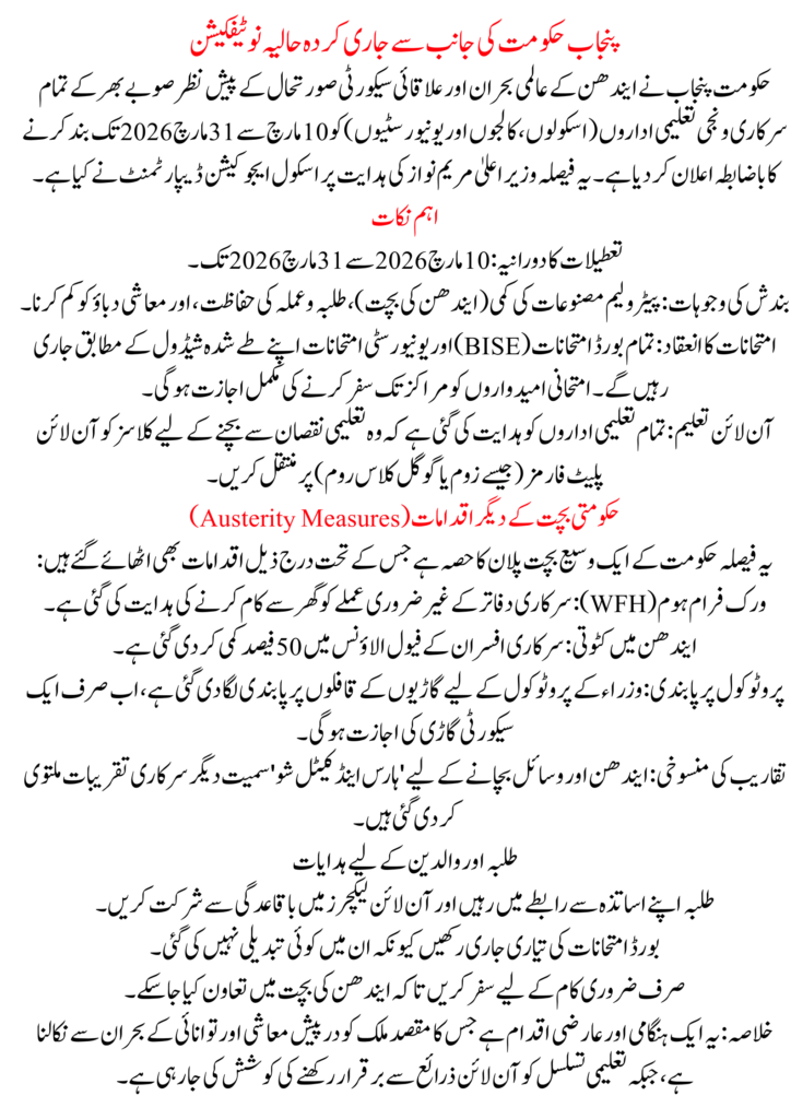 The Punjab Schools Closed Notification March 2026 is a temporary measure taken by the Punjab government to deal with the ongoing fuel crisis and economic pressure. While physical classes are suspended from March 10 to March 31, 2026, the government has ensured that students’ education continues through online learning and scheduled examinations.